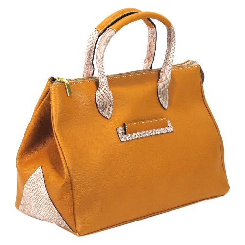 Handles: Two top handles D:5" , additional snake print leather sho... Alex.Max BV2509 055 Genuine Leather Naples Tan Classic Satchel Top Handle Bag